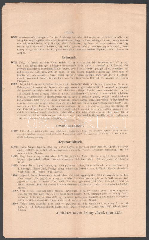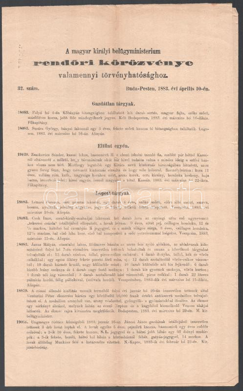 Leírás: 1883 M. kir belügyminisztérium körözvényei 32 . szám. elveszett, ellopott tárgyak, talált gyermek, hulla stb 4 p.