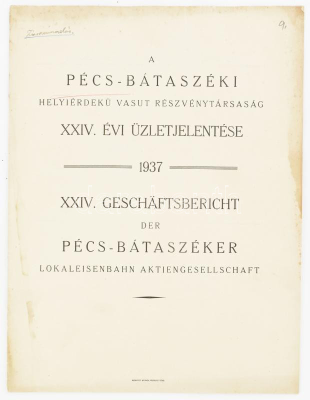 1937, A Pécs-Bátaszéki Helyiérdekű vasút részvénytársaság XXIV. évi üz... https://www.darabanth.com/hu/452-Gyorsarveres/452.0/Mutargy-papirregiseg-egyeb/Nyomtatvanyok~1000014/1937-A-Pecs-Bataszeki-Helyierdeku-vasut-reszvenytarsasag-XXIV-evi-uzletjelentese-Magyar-Nemet~II3010641