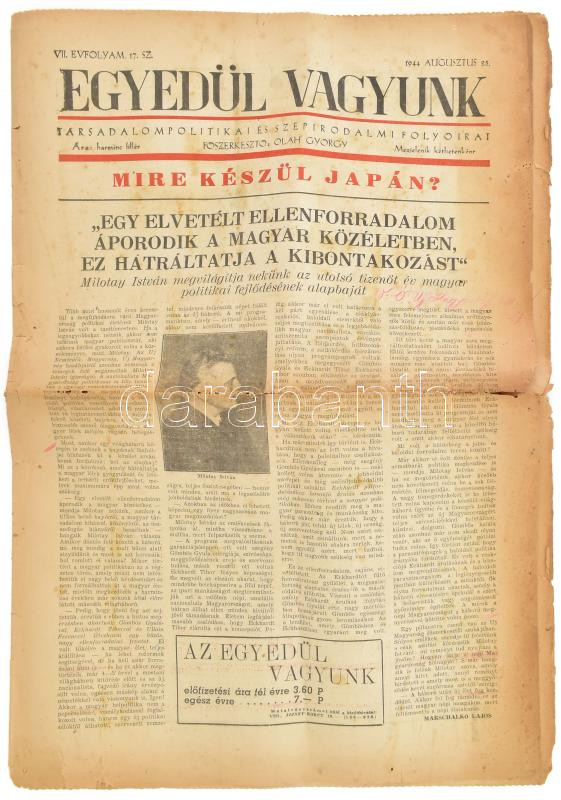 1944 Az Egyedül vagyunk c. hungarista lap VII. évf. 17.szám. (augusztu... https://www.darabanth.com/hu/452-Gyorsarveres/452.0/Mutargy-papirregiseg-egyeb/Nyomtatvanyok~1000014/1944-Az-Egyedul-vagyunk-c-hungarista-lap-VII-evf-17szam-augusztus-25-kisse-serult~II3007461