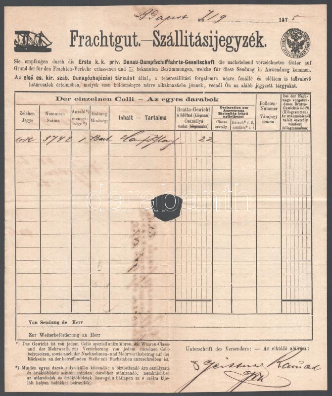 1876 Vác-Pest DDSG (Első Dunagőzhajózási Tárasaság) fuvarlevél / DDSG ... https://www.darabanth.com/hu/452-Gyorsarveres/452.0/Mutargy-papirregiseg-egyeb/Okmanyok~500021/1876-Vac-Pest-DDSG-Elso-Dunagozhajozasi-Tarasasag-fuvarlevel-DDSG-bill-of-freight~II2812549