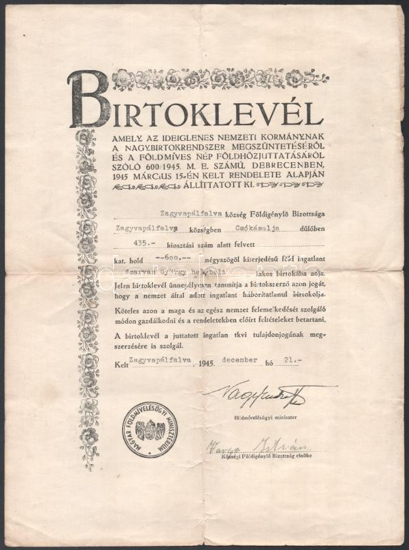 Leírás: 1945 Zagyvapálfalva, birtoklevél, Nagy Imre földmívelésügyi miniszter nyomtatott aláírásával, hajtva, 31,5x23 cm