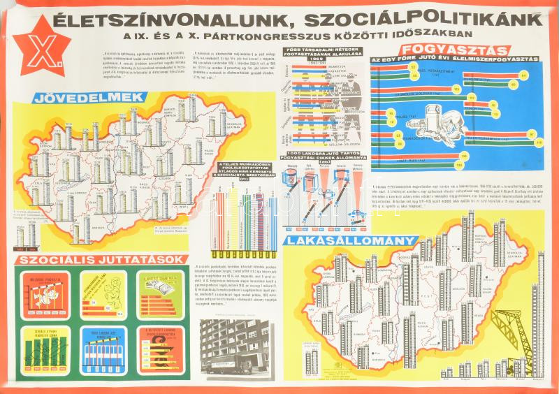 Leírás: Életszínvonalunk, szociálpolitikánk a IX. és a X. pártkongresszus közötti időszakban. 97x68 cm, kis beszakadásokkal, feltekerve