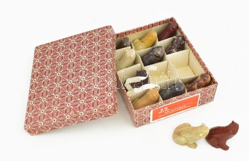 Leírás: 12 db kínai jáde béka figura, eredeti dobozában egyenként m:3,5 cm
