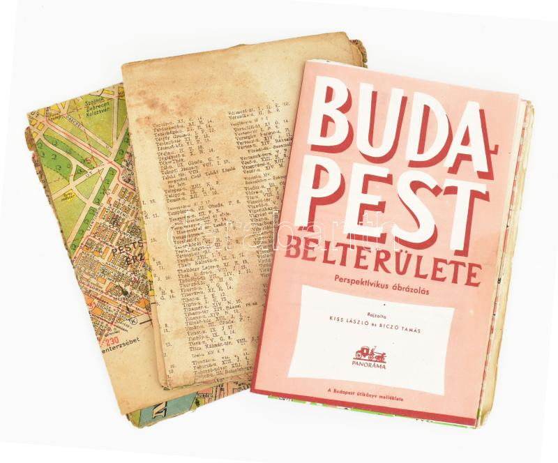 Leírás: 1944 Budapest térképe teljes utcajegyzékkel, szétvált, rossz állapotban + Budapest belterülete, perspektivikus ábrázolás, 90x67 cm