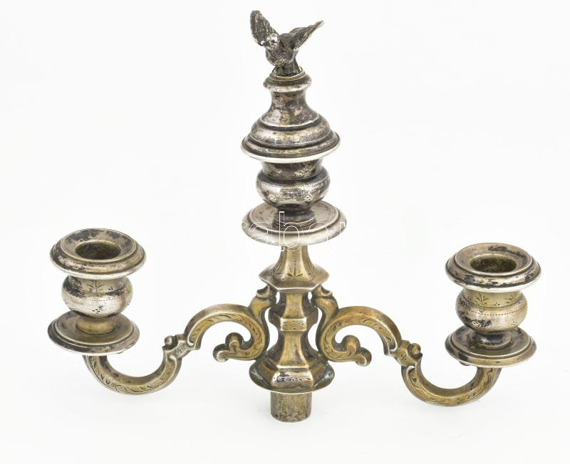 Leírás: Ezüst (Ag) gyertyatartó felső rész. Kiszedhető madár figurás a teteje. Vésett, Dianás jelzéssel 402 g 22x25 cm
