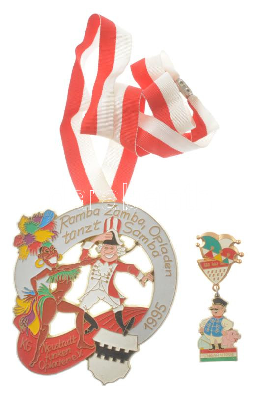 Németország 1995. "Ramba Zamba, Opladen tanzt Samba 1995 / KG Neustadtfunken Opladen e. V." + 1995. "Ungarn 1995", egyik nyakba akasztható, másik feltűzhető hagyományőrző egyesületi karneváli medál T:AU Germany 1995. "Ramba Zamba, Opladen tanzt Samba 1995 / KG Neustadtfunken Opladen e. V." + 1995. "Ungarn 1995", one is hangable, other is pin traditional preservation association carneval medal C:AU