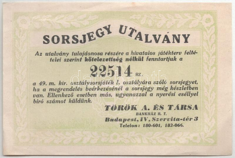 https://www.darabanth.com/hu/452-Gyorsarveres/452.0/Numizmatika/Reszvenyek-es-sorsjegyek~2500005/Budapest-1941-Sorsjegy-Utalvany-a-49-magyar-kiralyi-osztalysorsjatek-I-osztalyara-Torok-A~II3014442