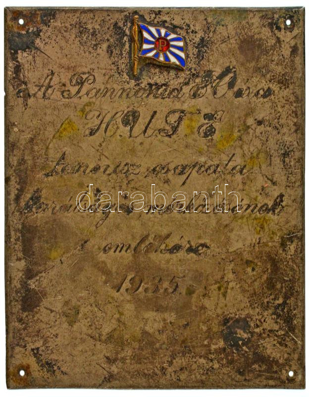 1935. "A Pannonia EC és a HUTE tennisz csapata barátságos mérkőzésének emlékére 1935" ezüstözött fém lemezplaketta a Pannonia EC zománcozott cíerével, a négy sarkánál négy apró lyukkal a rögzítéshez (66x83mm) T:XF patina
