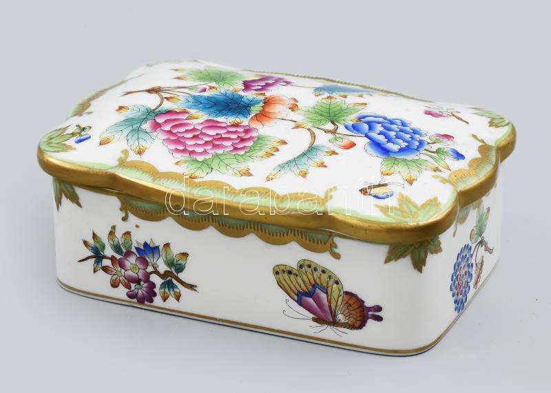 Herendi Viktória mintás porcelán bonbonier, kézzel festett, jelzett, k... https://www.darabanth.com/hu/452-Gyorsarveres/452.0/Porcelan-keramia-uveg/Porcelan~500007/Herendi-Viktoria-mintas-porcelan-bonbonier-kezzel-festett-jelzett-kopasnyomokkal-13-5x10x4-5-cm~II3011671