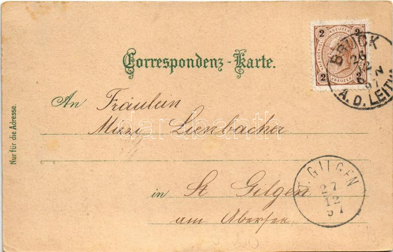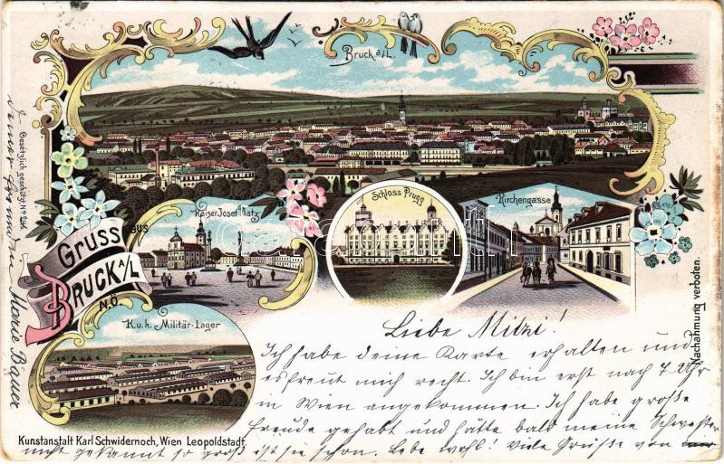 1897 (Vorläufer) Lajtabruck, Bruck an der Leitha; Kaiser Josef Platz, Schloss Prugg, Kirchengasse, K.u.k. Militär Lager. Karl Schwidernoch / Ferenc József tér, kastély, Templom utca, Katonai laktanya / square, street, castle, military barracks. Art Nouveau, floral, litho (EK)