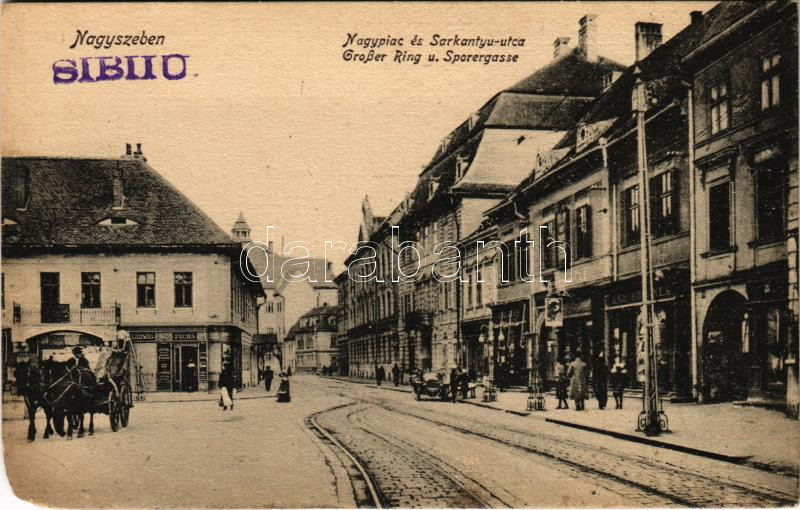 Nagyszeben, Hermannstadt, Sibiu; Nagypiac és Sarkantyú utca, Ludwig Fuchs üzlete. Vasúti levelezőlapárusítás 3. sz. 1918. / Grosser Ring u. Sporergasse / street view, shops (EM)