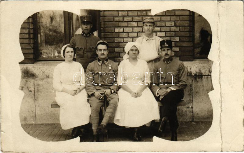 1915 Budapest, sérült osztrák-magyar katonák csoportja nővérekkel / WWI Austro-Hungarian K.u.K. military, group of injured soldiers with nurses. photo (fa)