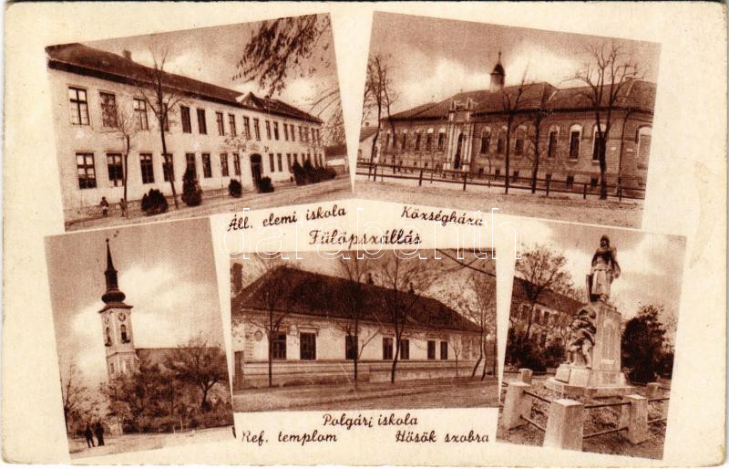Leírás: Fülöpszállás, Állami elemi iskola, Községháza, Református templom, Polgári iskola, Hősök szobra