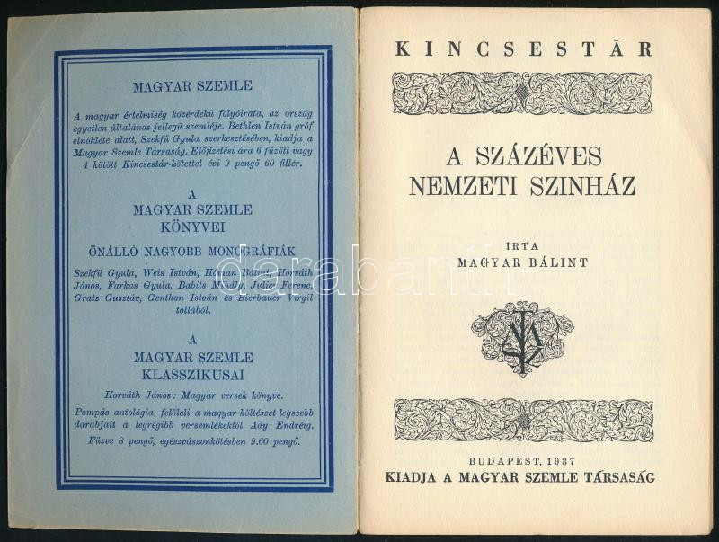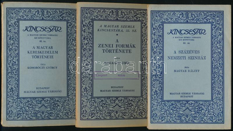 A Magyar Szemle Kincsestára 51., 55., 61. A százéves Nemzeti Színház, A zenei formák története, A magyar kereskedelem története. Bp., Magyar Szemle. Kiadói papírkötés, jó állapotban.