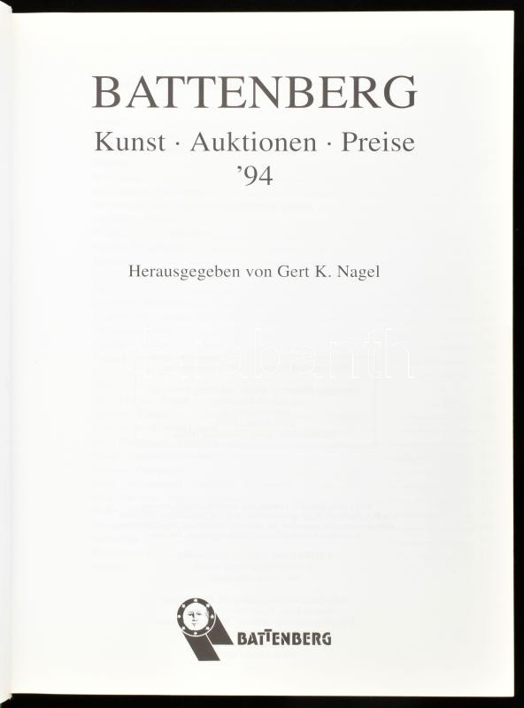 Leírás: Gert K. Nagel (szerk.): Battenberg Kunst - Auktionen - Preise 1994. Augsburg, 1993, Battenberg. Német nyelven. Kiadói kartonált papírkötésben.