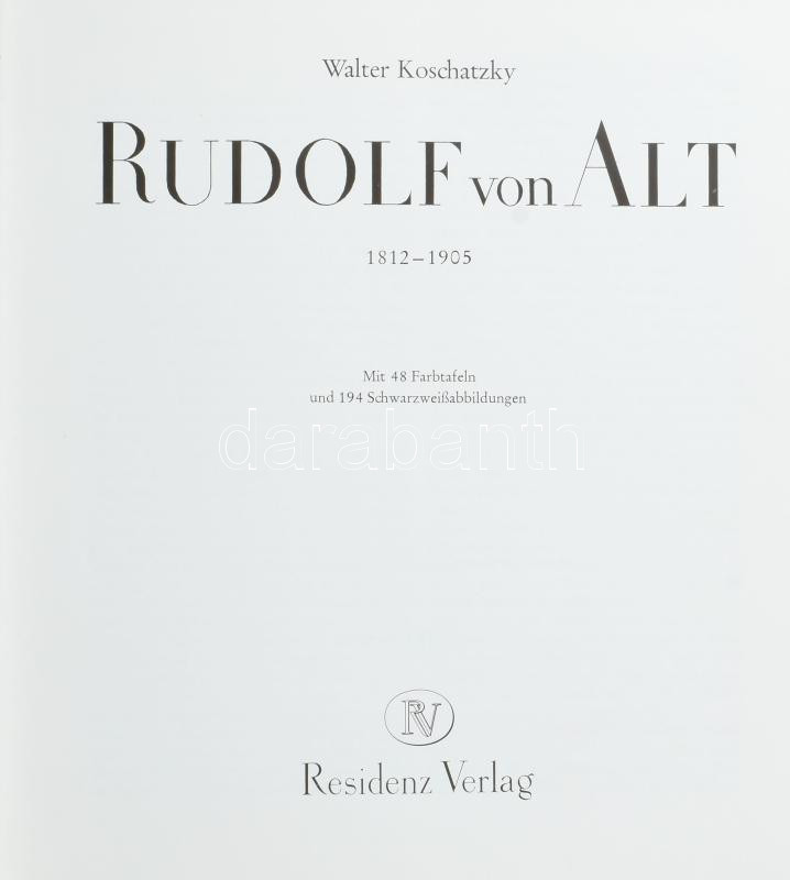 Walter Koschatzky: Rudolf von Alt. Salzburg 1975. Residenz Verlag, Sorszámozott 281. sorszámú példány. 319p. Kiadói vászonkötésben. Rudolf Alt osztrák festő aki magyar táj és városképeiről is ismert.