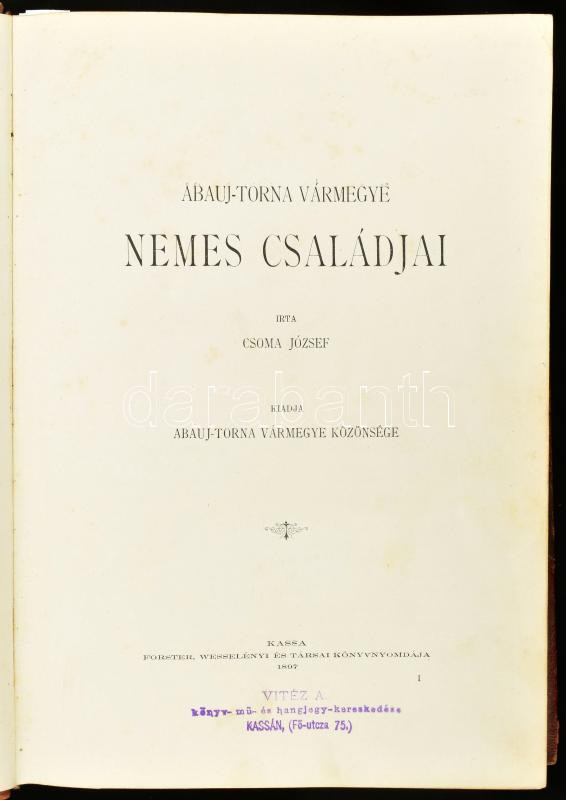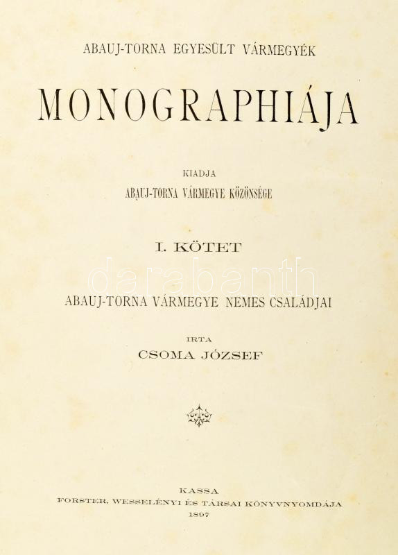 Csoma József: Abauj-Torna vármegye nemes családjai. Abauj-Torna egyesült vármegyék monographiája I. kötet. Kiadja Abauj-Torna vármegye közönsége. Kassa, 1897, Forster, Wesselényi és Társai-ny., XIV+(4)+672 p. (a 656. oldalnál + 4 p.) + 8 (címerrajzok) t. Korabeli, aranyozott gerincű félbőr-kötésben, márványozott lapélekkel, kopottas borítóval és gerinccel, helyenként foltos lapokkal, a belső kötéstáblán és a címlapon bélyegzővel (Vitéz A. könyv- mű- és hangjegy-kereskedése Kassán).