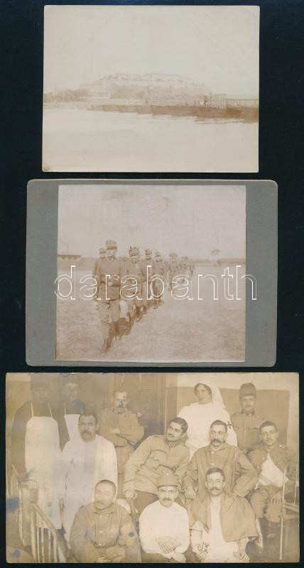 Leírás: cca 1900-1915 3 db katonafotó, közte péterváradi pontonhíd, 8×10 és 9×14 cm közötti méretekben