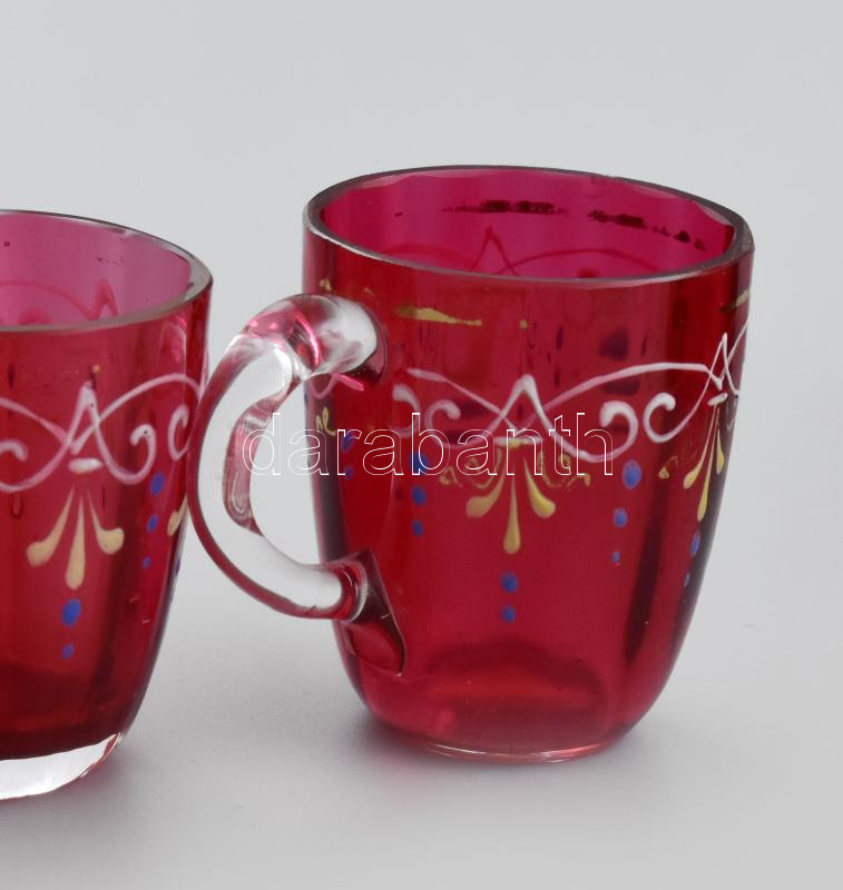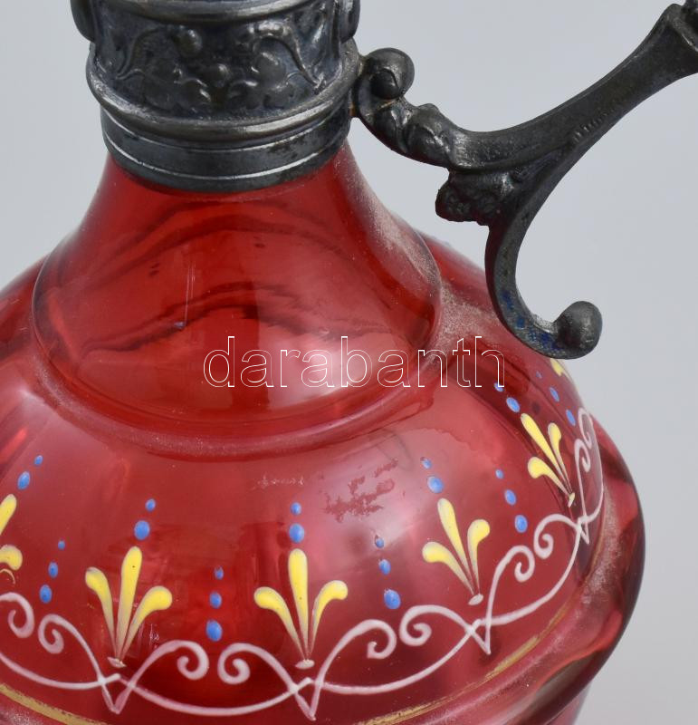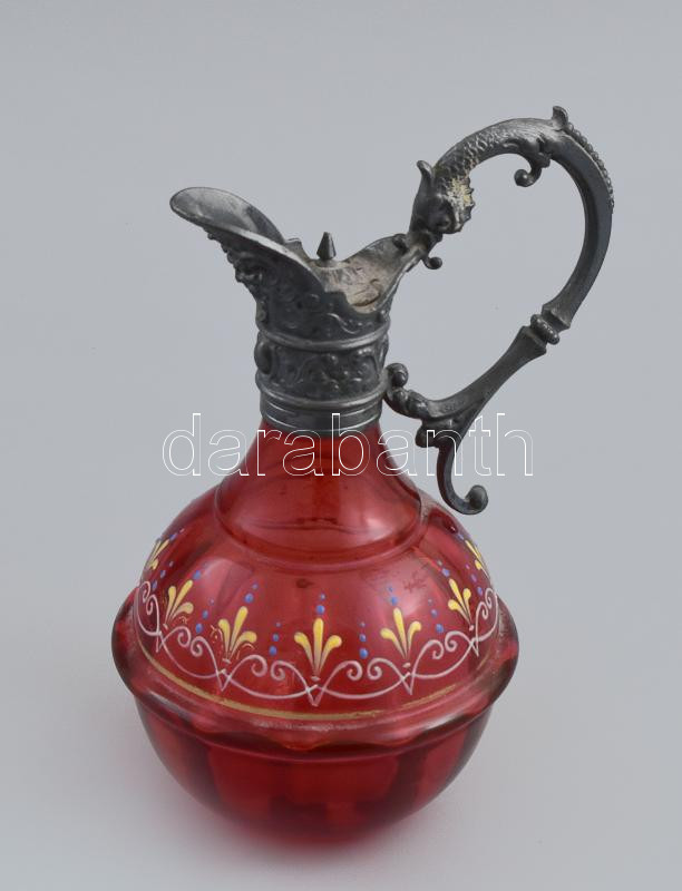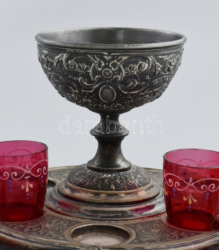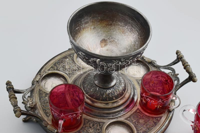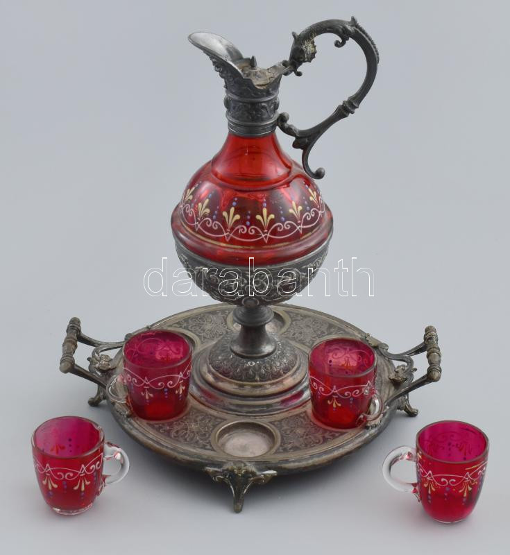 Leírás: Antik likőrös készlet. Vésett réz lábas tálcán, ón és üveg karaffa, hozzá 4 db festett üveg pohár, anyagában színezett. m: 26 cm