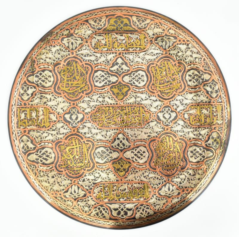 Leírás: Dísztál Koránból vett idézetekkel. Vörösréz, kézzel karcolt, festett. d: 40 cm szélén kis sérüléssel