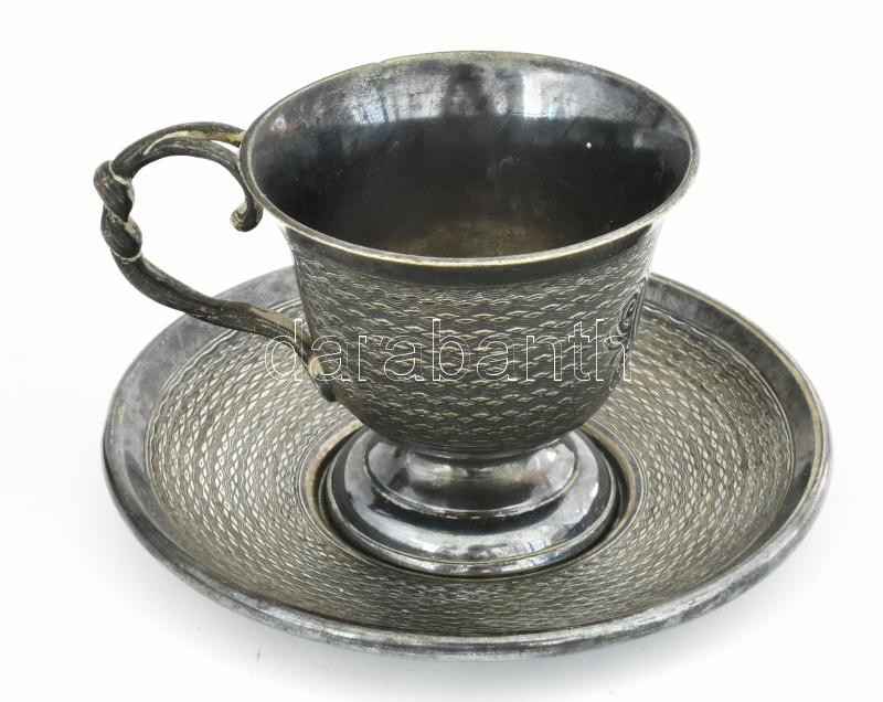 Leírás: Szecessziós ezüstözött csésze alátéttel. Gilosált díszítéssel, csomózott kötelet formázó csészefüllel, jelzéssel, kopással, d: 11 cm, m: 7 cm