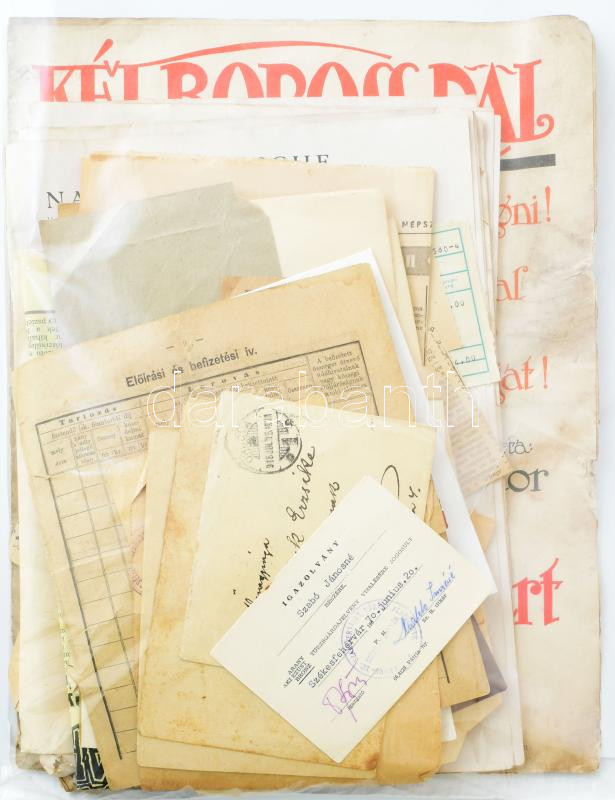 Leírás: Vegyes papírrégiség tétel: igazolványok, munkakönyv, szentképek, újságok, stb.
