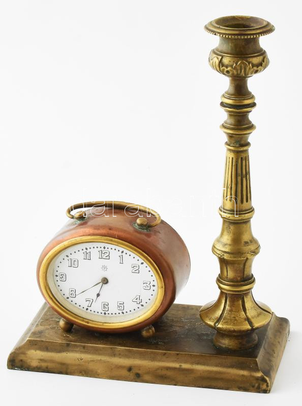 Leírás: Junghans asztali óra gyertyatartóval, bronz, réz, felhúzóhiánnyal, pótlással, kopással, 16x9x22 cm
