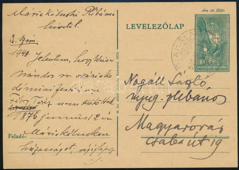 Leírás: 1940 Máriakálnok, Dr. Ratzenböck Károly plébános, ny. tábori főesperes saját kezűleg megírt levelezőlapja, Nagáll László nyug. plébános részére