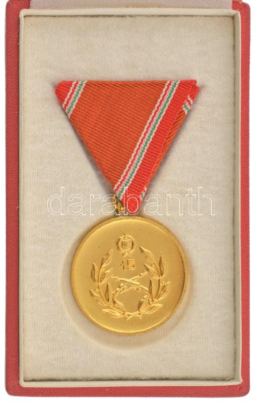 Leírás: 1983. "Honvédelmi Érdemérem 15 év után" aranyozott bronz kitüntetés mellszalagon, tokban T:AU
