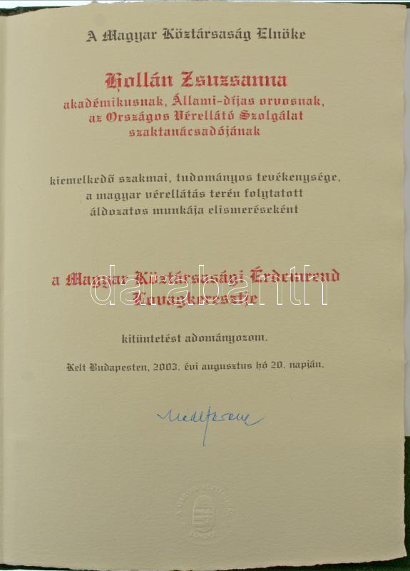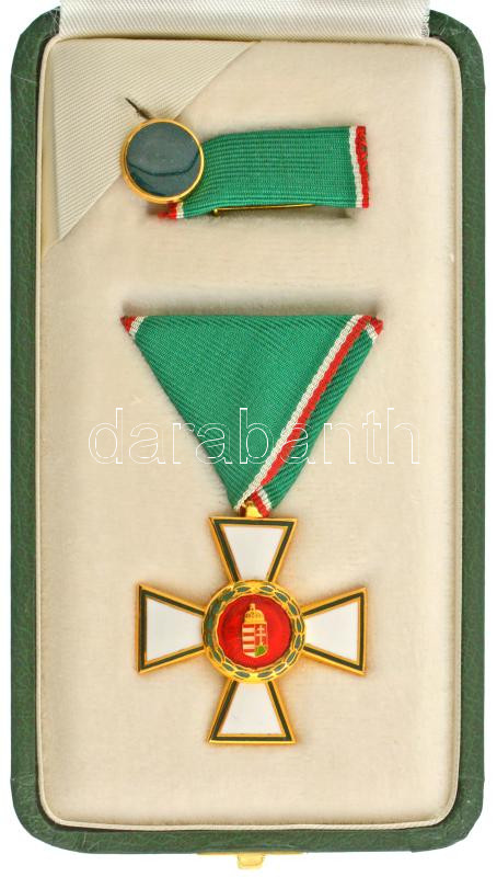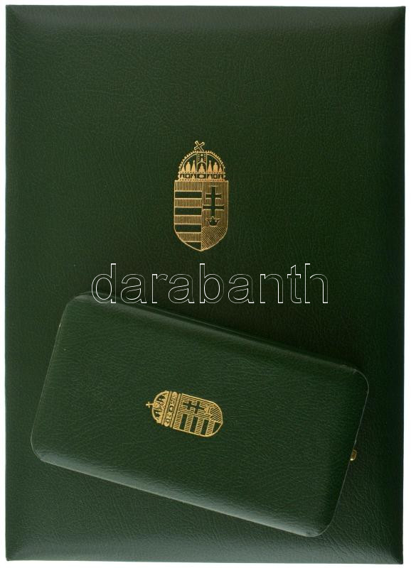 1991. "A Magyar Köztársasági Érdemrend lovagkeresztje, polgári tagozat" zománcozott, aranyozott Ag kitüntetés fémjel nélkül, mellszalagon, szalagsávval, rátét nélküli rozettával, eredeti tokban, adományozói okirattal, viselÅ‘i igazolvánnyal, meghÃvóval, újságcikkel T:UNC Hungary 1991. "Order of Merit of the Hungarian Republic, Knight's Cross, Civilian Grade" enamelled, gold plated Ag decoration without hallmark, with ribbon, service ribbon and green enamel rosette, in original case with a donation document, bearer card, invitation and newspaper article C:UNC NMK 741.