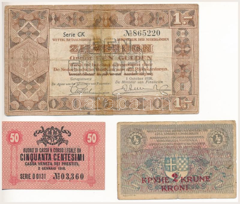 Leírás: Vegyes: Hollandia 1938. 1G "Zilverbon (Ezüstértékű bankjegy) + Jugoszlávia / Szerb-Horvát-Szlovén Királyság 1919. 1/2D 2K-ás piros, "KPYHE 2 KRUNE KRONI" felülbélyegzéssel + Olaszország / Velence / Osztrák-magyar megszállás 1918. 50c T:F-G