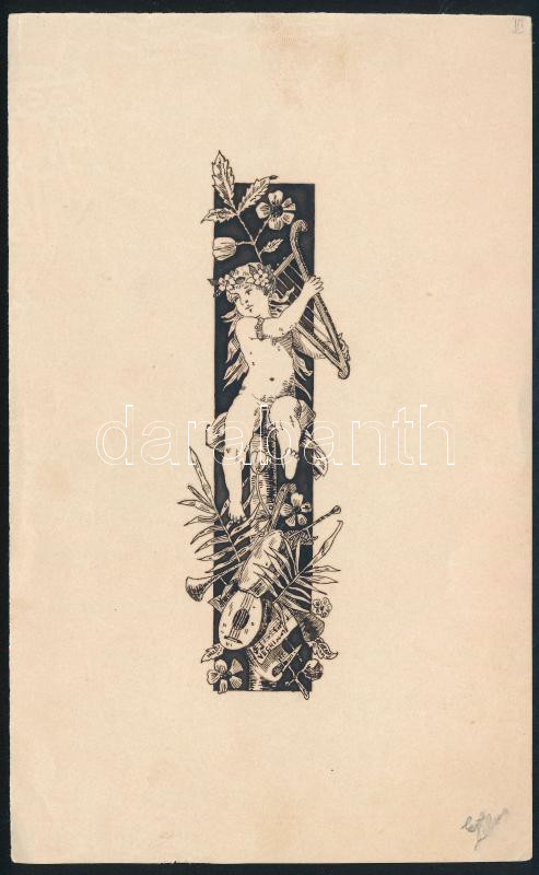 1897 Nagyenyed, kisgrafika/ex libris/illusztráció terv, tus, papír, elmosódott jelzéssel a lap jobb alsó sarkában, rajzon Veghi (?) jelzéssel, hátoldalán Nagyenyed felirattal és datálással, kb. 11x3 cm, papír: 17x10 cm
