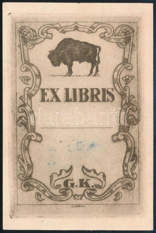Leírás: Conrad Gyula (1877-1959): Ex libris G.K. (Gutenberg Könyvkiadó). Rézkarc, papír, jelzett a karcon, 9,5×6 cm