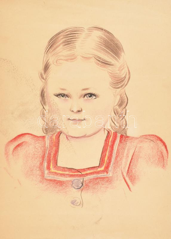 Leírás: Jelzés nélkül: Copfos lány arcképe. Ceruza, papír. Kissé sérült (hajtás- és törésnyomokkal). Kissé foltos. 35x25 cm.