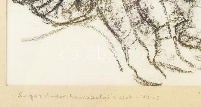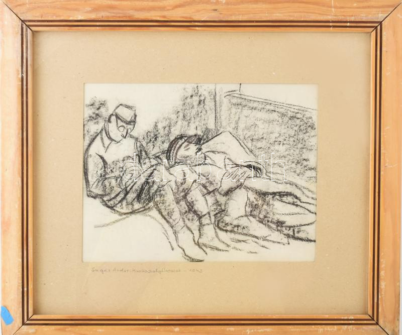 Leírás: Jelzés nélkül: Pihenők (munkaszolgálatosok?). Szén, papír, paszpartun és hátoldalán Sugár Andor felirattal. Üvegezett, kopott fakeretben. 21,5x28 cm