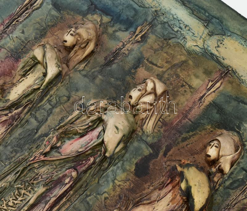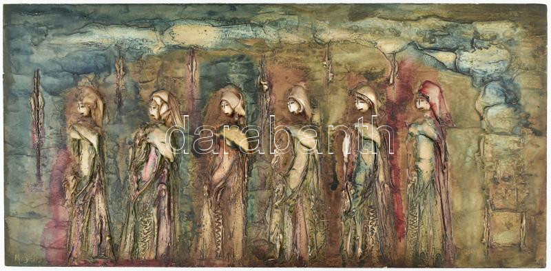 Leírás: M. David jelzéssel: Vándorló nők. Farost, műgyanta, kis kopással, 28x57 cm