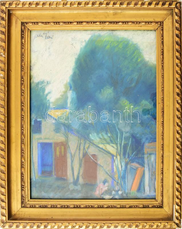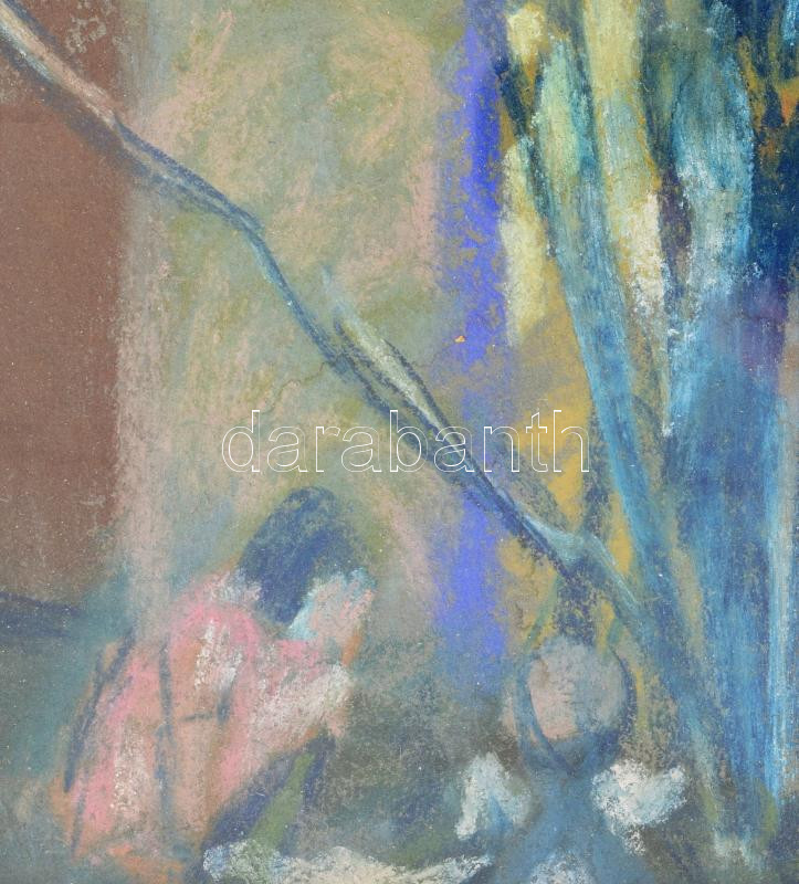 Leírás: Olvashatatlan jelzéssel (Miháltz Pál?): Játszó gyerek. Pasztell, papír. Üvegezett, dekoratív, kissé sérült fakeretben, 41×32 cm