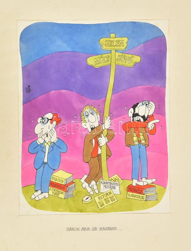 Balázs Piri Balázs (1937-2014): Három árva sír magában (megjelent: Ludas Matyi, 1988. ápr. 20.). Tus, akvarell, papír, jelezve balra középen. Paszpartuban. Paszpartu hátoldalán feliratozott. 36x27 cm