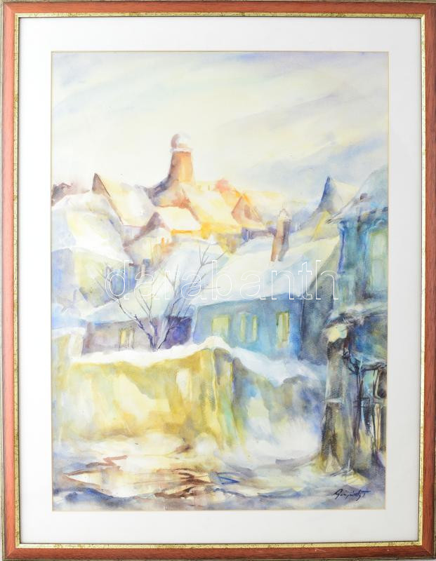 Leírás: Gáspárdy Tibor (1960-): Soproni városrészlet. Akvarell, papír, jelzett, 63,5×46,5 cm, üvegezett fakeretben.