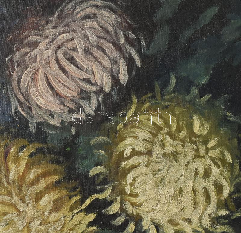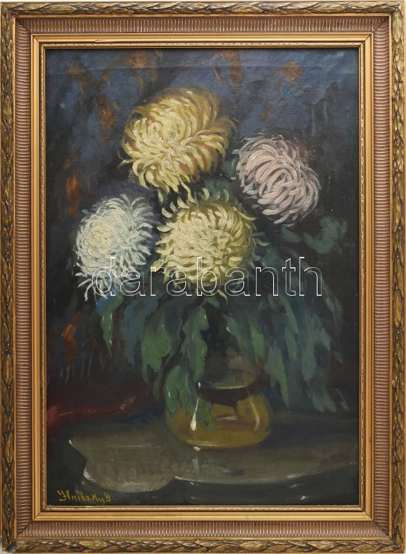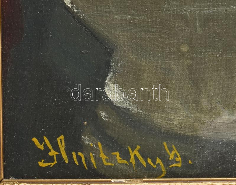 Leírás: Ilnitzky Imre (?-?), működött a XX. sz. első felében: Csendélet. Olaj, vászon, jelzett. Dekoratív, bal sarkaiban kissé sérült fakeretben, 60×40 cm