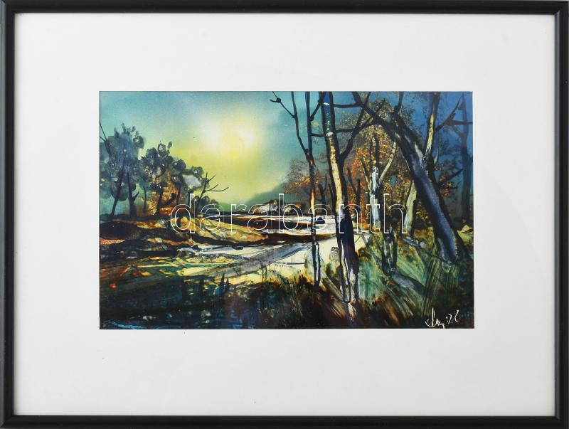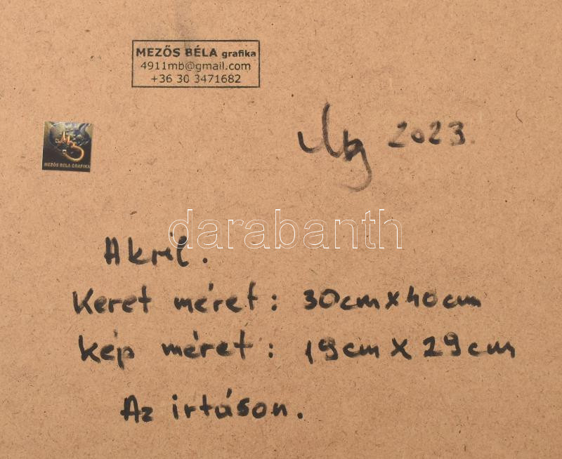 Mezős Béla (1949- ): Irtáson. Akril, karton. Jelzett, üvegezett keretben a hátoldalon a művész bélyegzőjével, és autográf feliratával 19x29 cm Keret méret 30x40 cm