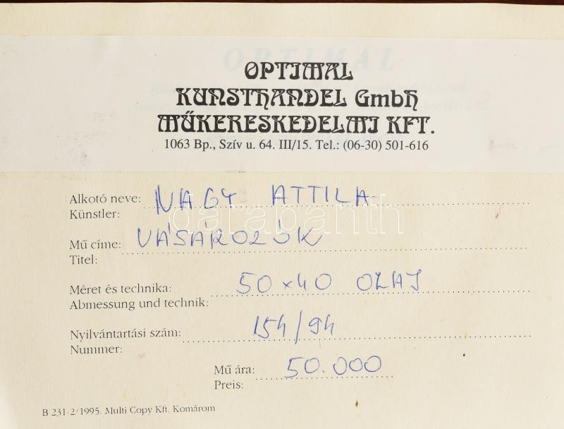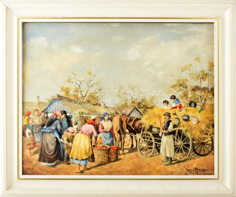 Nagy Attila (?-): Vásározók. Olaj, fatábla, jelzett, hátoldalán címkén... https://www.darabanth.com/hu/454-Gyorsarveres/454.0/Festmenyek-es-grafikak/Festmenyek-es-grafikak~500001/Nagy-Attila-Vasarozok-Olaj-fatabla-jelzett-hatoldalan-cimken-feliratozott-fakeret~II3024267