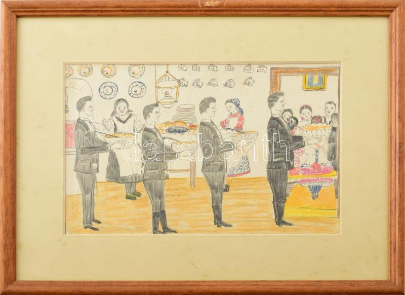 Leírás: Orisekné Farsang Erzsébet (1929-): Ünnepség. Színes ceruza, papír, jelzés nélkül, hátoldalán névvel feliratozott, üvegezett fakeretben, 16x25 cm