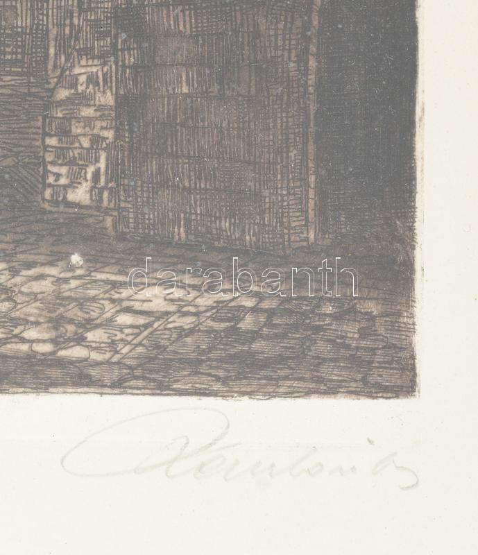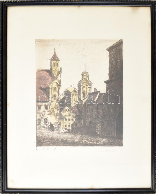 Leírás: Paulovits Pál (1892-1975): Augsburg. Színezett rézkarc, papír, jelzett. Üvegezett fakeretben, lapszéli kisebb foltokkal, 30×22 cm.