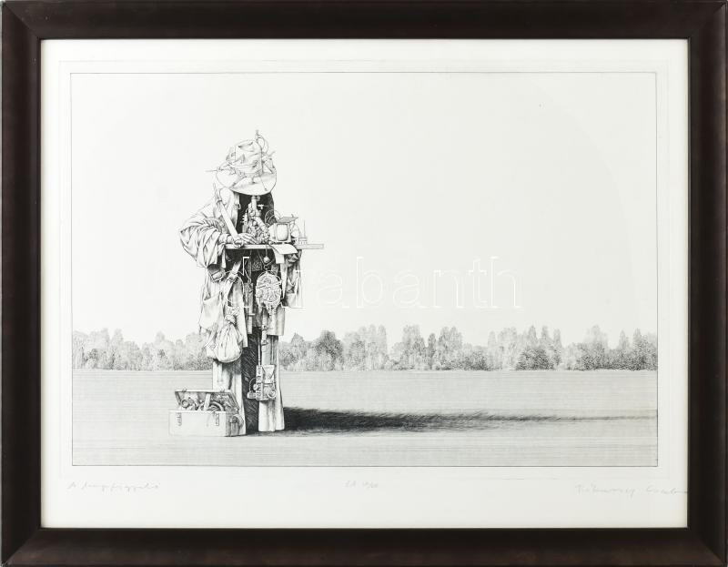 Leírás: Rékassy Csaba (1937-1989): A megfigyelő. Rézmetszet, papír, jelzett, művészpéldány E.A. VII/VII számozással, üvegezett fakeretben. 34x49 cm