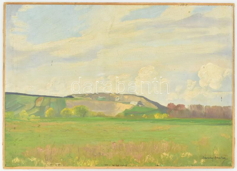 Leírás: Sárdy Brutus (1892-1970): Dombos táj. Olaj, vászon, kartonra kasírozva, jelzett, hátoldalán töredékes kiállítás raglappal az 1930-as évekből. 37,5x53 cm