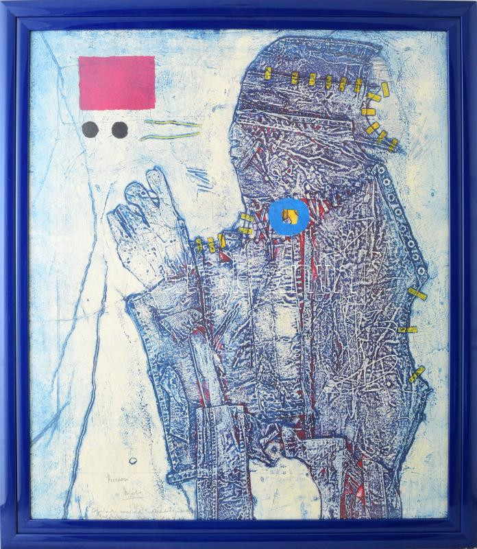 Sziráki Endre (1944-?): Harcos. Vegyes technika, papír, jelezve balra lent, Sziráki Endre autográf ajándékozási soraival 1973-ból. Üvegezett fakeretben. 69x59 cm