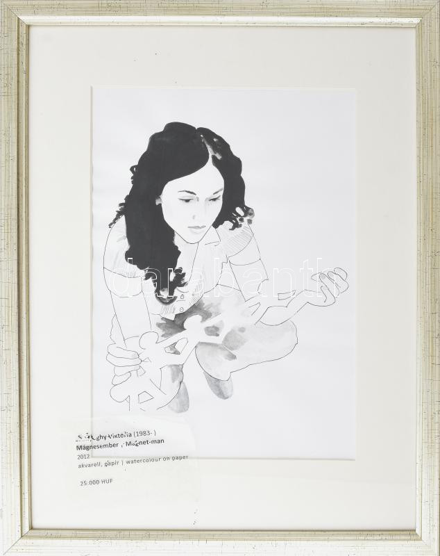 Leírás: Szunyoghy Viktória (1983-): Mágnesember. Akvarell, tus, papír, jelzés nélkül. Címkén feliratozott. Üvegezett fakeretben. 29x21 cm