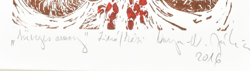 Leírás: Varga-Welther Júlia (1955): Süveges asszony, 2016. Linómetszet, vegyes technika, papír, jelzett. 21×15 cm