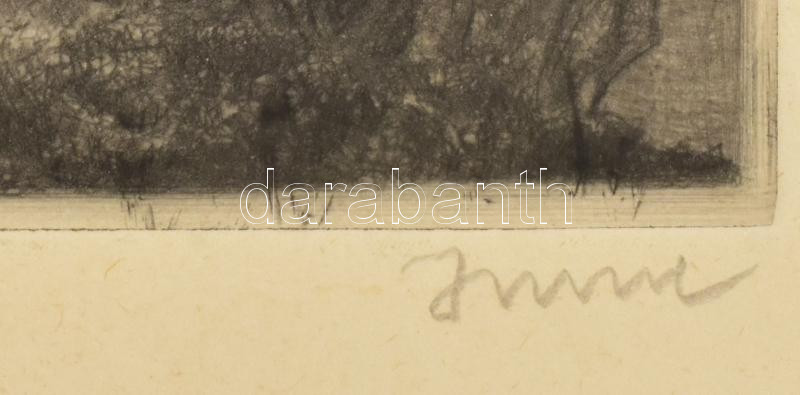 Leírás: ifj. Imre István (1950-): Fák a vízparton. Rézkarc, papír, jelzett, lap széle foltos és apró szakadással, 39×29,5 cm